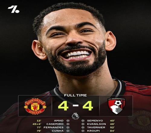 全场战罢,曼联主场4-4上演进球大战收获平局,近5次对阵伯恩茅斯3平2负难求一胜,B费传射当选MVP。